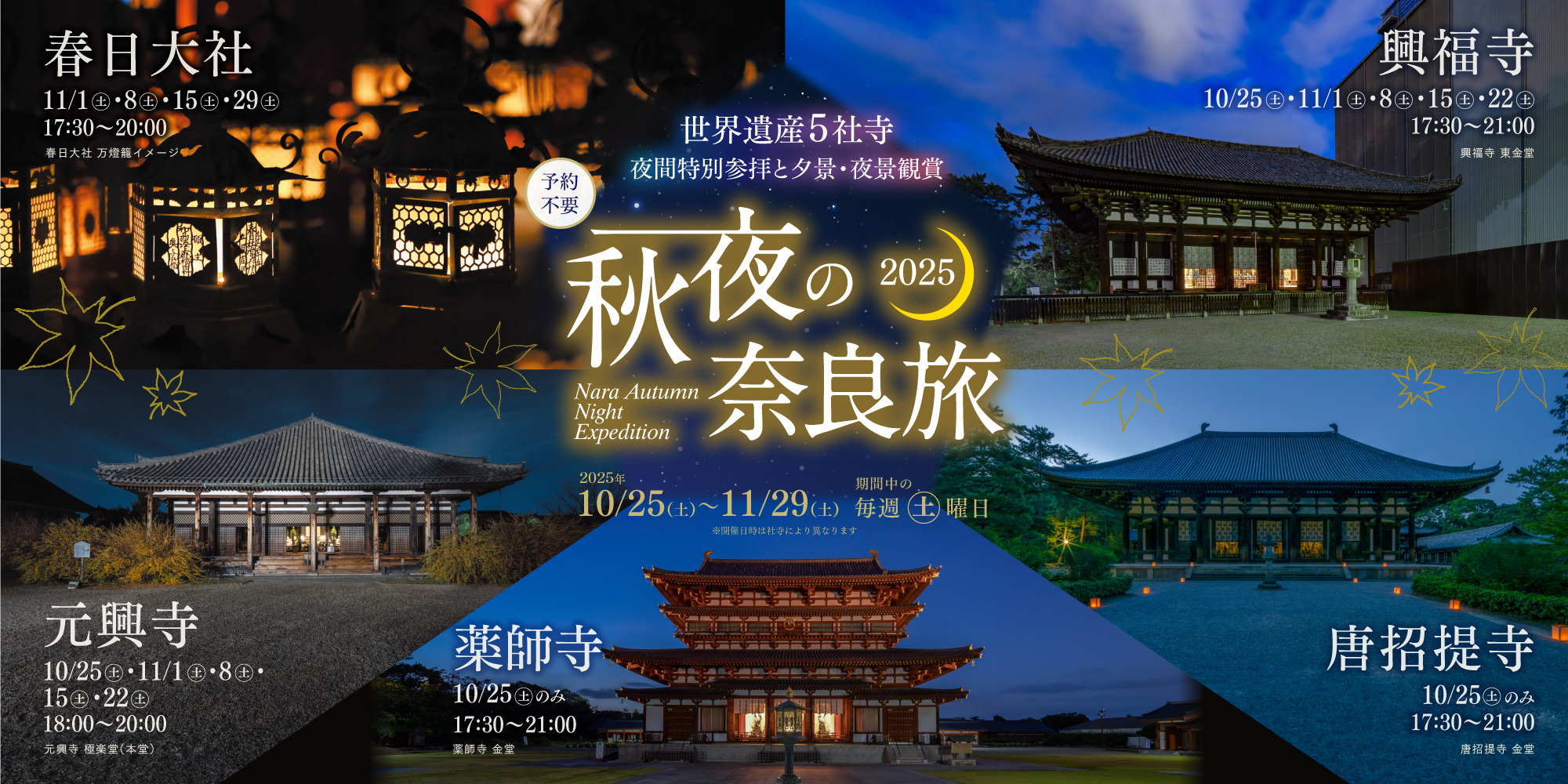 世界遺産5社寺の夜間特別参拝や、若草山からの夕景・夜景観賞など、 秋の夜を満喫できる企画をご紹介!