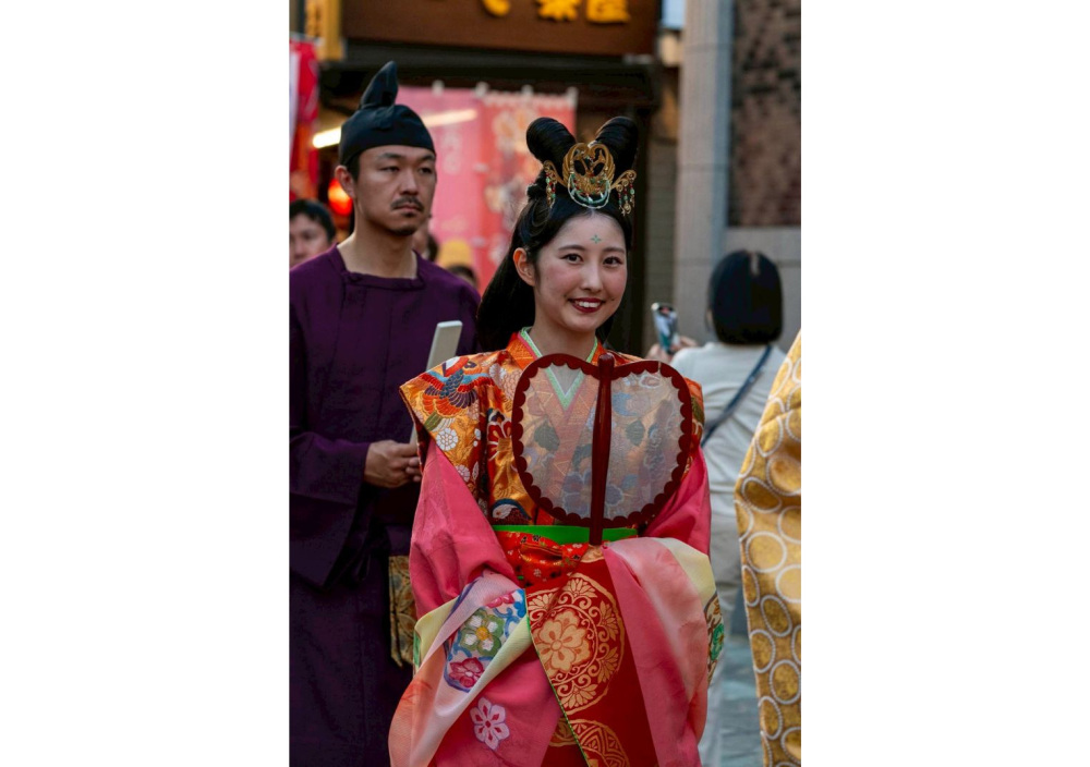 6日例祭の「花扇奉納(はなおうぎほうのう)行列」では、黄色と橙、桃色の時代衣装を身にまとい三条通りを練り歩きました。今まで行事で着用してきた天平衣装とは少し異なる軽やかな素材で、秋風に揺れる裾の感覚がとても新鮮でした👘 🍂沿道にはたくさんの方がおられ、笑顔で手を振ってくださる姿に胸が温かくなりました。