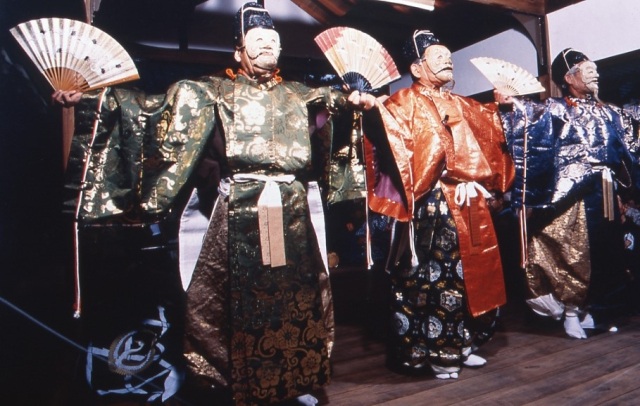 19:00からの「おたいまつ」は、長さ7mあまりの大松明(おたいまつ)が10本、籠松明が1本、僧侶を先導して本堂の周囲を回ります。正面の三面扉が開き、たいまつ行道にあわせて灯明で照らされた内陣では雅楽が演奏され、鐘楼の鐘の音がゆったり聞こえてきます。