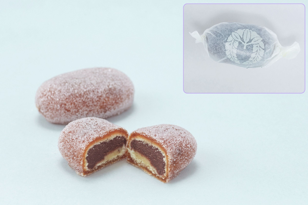 春日大社の神饌の「二つ梅枝」がモチーフ。なめらかなこし餡を生地に詰めて揚げた「餡ドーナツ」風の饅頭です。