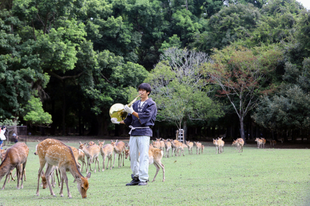 ナチュラルホルンの音色に誘われて、鹿さんが集まってくる奈良の朝の風物詩「鹿寄せ」を春日大社境内 飛火野(とびひの)でこの夏も開催。
