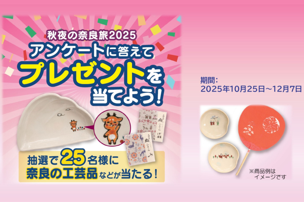 秋夜の奈良旅2025 アンケート実施中 秋夜の奈良旅2025ではご意見やご感想など、皆さまのお声をお待ちしております。ご回答いただいた方から抽選で計25名様に奈良の工芸品などをプレゼントいたします。なお、当選者の発表は発送をもってかえさせていただきます。この機会に奈良の工芸品を手に取ってみてはいかがでしょうか。 世界遺産5社寺 夜間特別参拝アンケート アンケートに答える 奈良若草山 トワイライト・夜景観賞バス アンケート アンケートに答える 秋夜の奈良旅2025の特設サイトはこちら 世界遺産5社寺で秋の夜間特別参拝と夕景・夜景観賞!秋夜の奈良旅2025 もっと見る