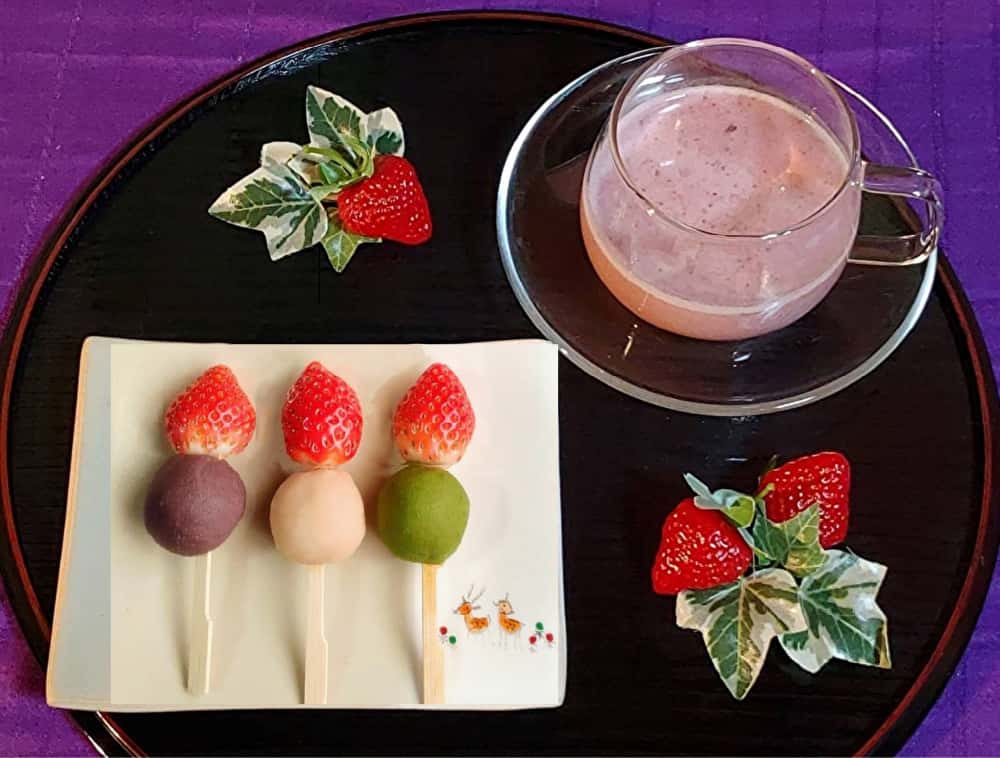 奈良県産いちご串だんご& いちごミルク葛湯(Hot)の紹介|ならまち 招福庵