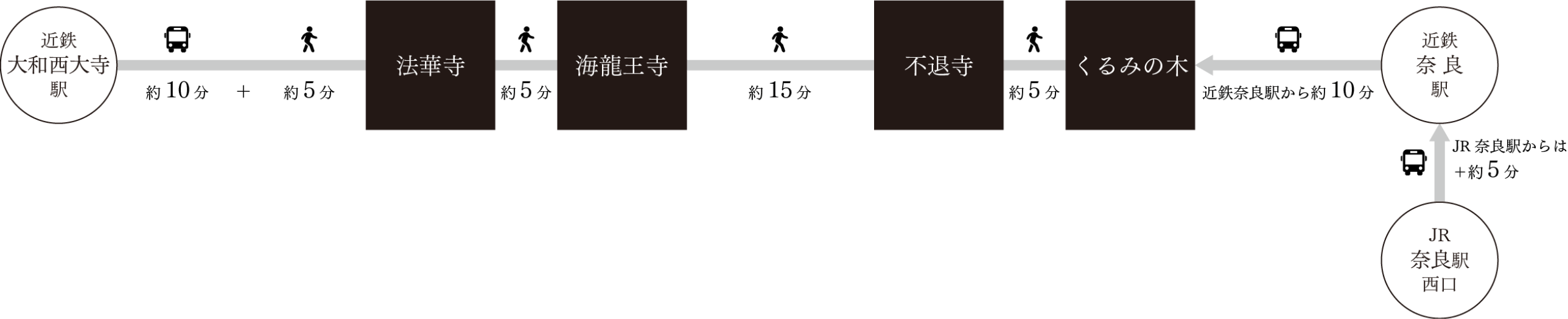 | 12 | 【大和西大寺駅から乗る場合】「JR奈良駅西口」行き 【近鉄奈良駅・JR奈良駅から乗る場合】「大和西大寺駅」行き | 法華寺…「法華寺」 海龍王寺…「法華寺」 不退寺…「一条高校前(不退寺口)」 くるみの木…「一条高校前(不退寺口)」 |
