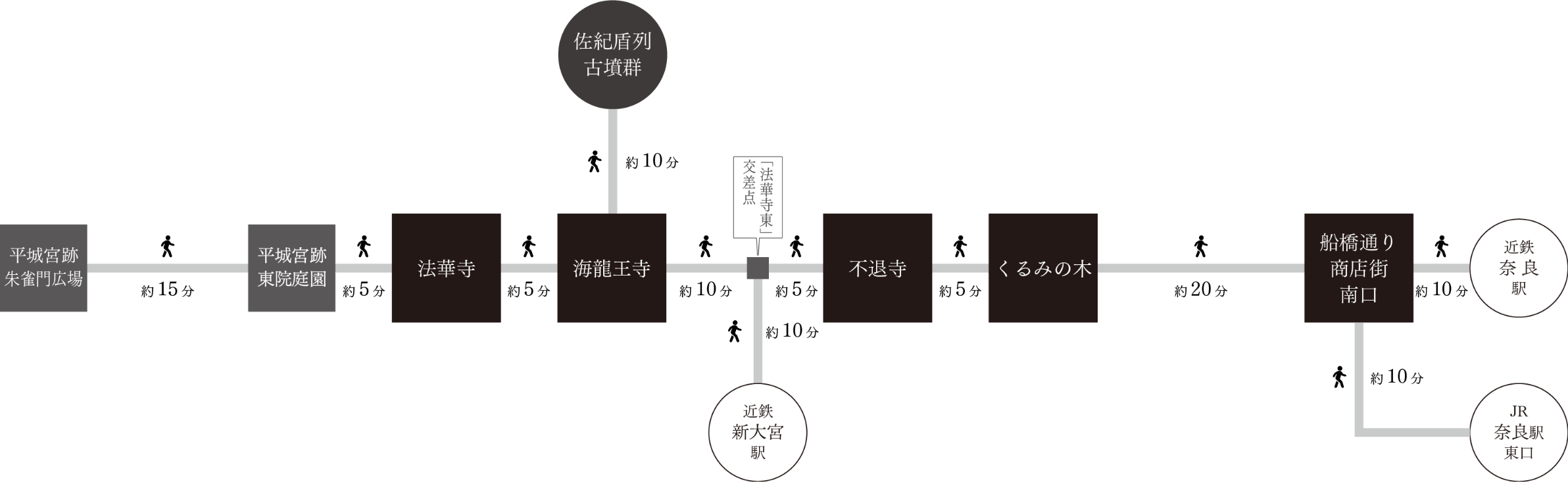 気候の良い季節などは、徒歩やレンタサイクルでのアクセスもおすすめです。近鉄・JR奈良駅からレトロな船橋通り商店街を通って佐保路エリアへ向かったり、近鉄新大宮駅から佐保川を越えて向かったり。平城宮跡を起点に散策するのもおすすめです。佐保路エリアの巡り方は様々、お好みに合わせてお出かけしてみてはいかがでしょうか?