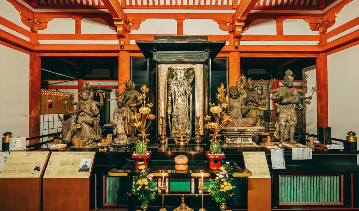 旅行や留学の安全祈願のお寺として親しまれている海龍王寺。山門と築地塀は佐保路を代表する風景のひとつです。もとは光明皇后が自身の皇后宮を寺院として整備し、唐から帰国した玄昉が初代住職に就いたことで「平城宮内道場」に定められたことに始まります。皇后宮の北東隅にあるため古くは「隅寺(すみでら)」とも呼ばれ、奈良時代から般若心経(隅寺心経)の写経が盛んに行われていました。現在でも、希望者は写経体験ができます(要予約)。本尊は十一面観音菩薩立像(重文)で特別開帳は春季と秋季など年3回。