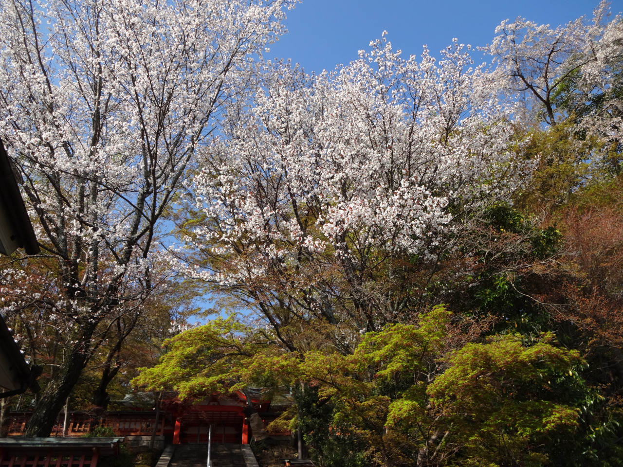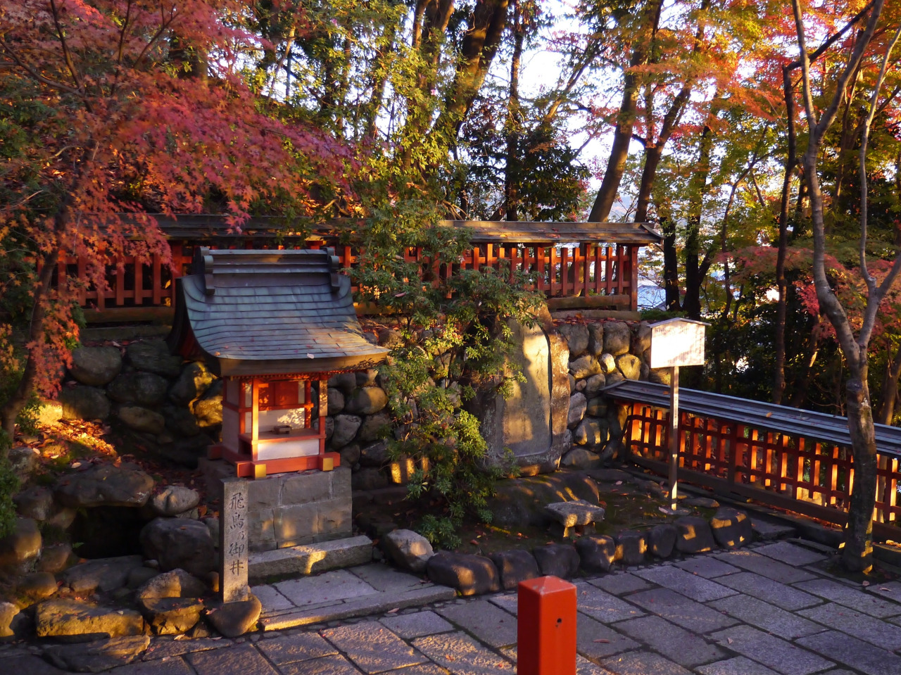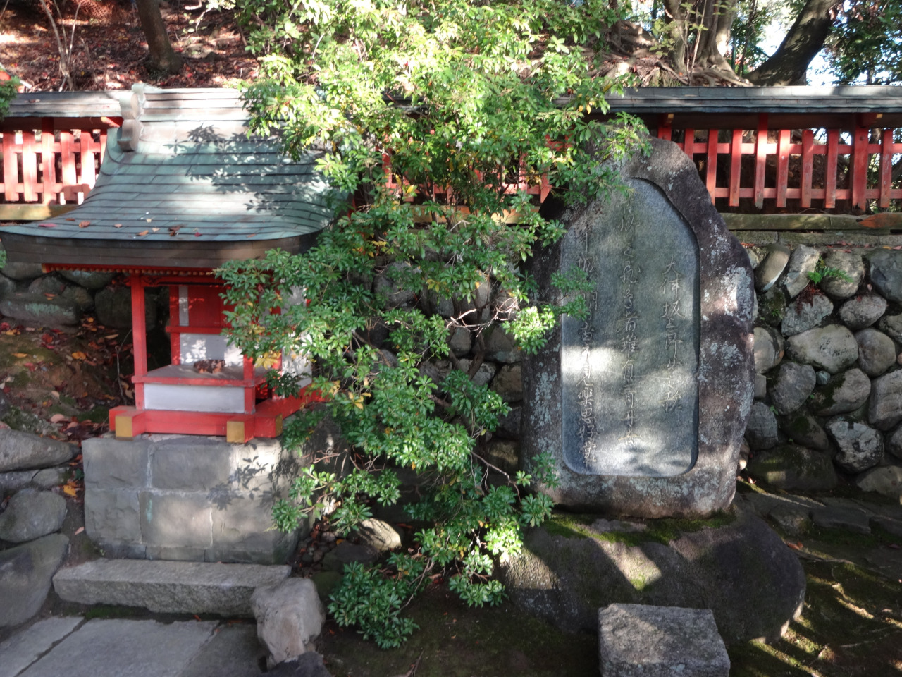 奈良ホテルの東側の国道169号線を入った小径に一の鳥居があり、長い石段を登りつめると、朱色の美しい拝殿があります。そこから振り返ると、大和青垣(奈良盆地を囲む青々と美しい山々を形容する古来からの言葉)を見渡すことができ、空気の澄んだ日には、稀に大和三山を望むこともできる眺望の良い場所に佇む神社です。いにしえの飛鳥京にその佇まいが似ていることから「平城(なら)の飛鳥」ともいわれ、現在は、全域が歴史的風土特別保存地区(春日山特別保存地区)に指定されています。拝殿東側には、その情景を詠んだ大伴坂上郎女(おおとものさかのうえのいらつめ)の万葉歌碑があります。