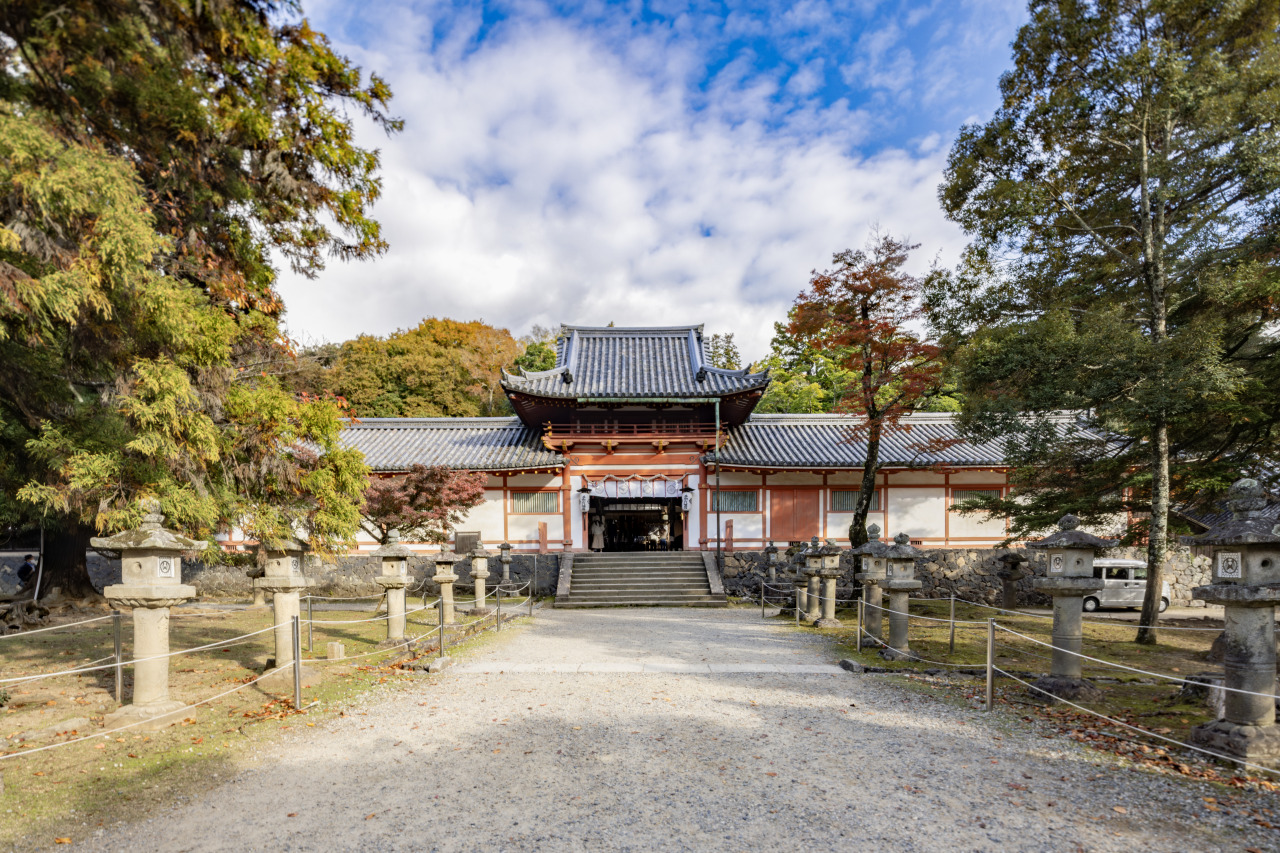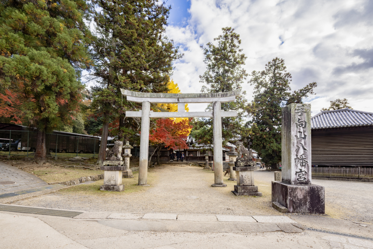 手向山の山麓にあり、天平勝宝元年(749)、東大寺の大仏(盧舎那仏)を造立する際、九州豊前国(大分県)の宇佐八幡宮より、東大寺の守譲神として勧請された歴史ある古社です。紅葉の名所としても知られています。