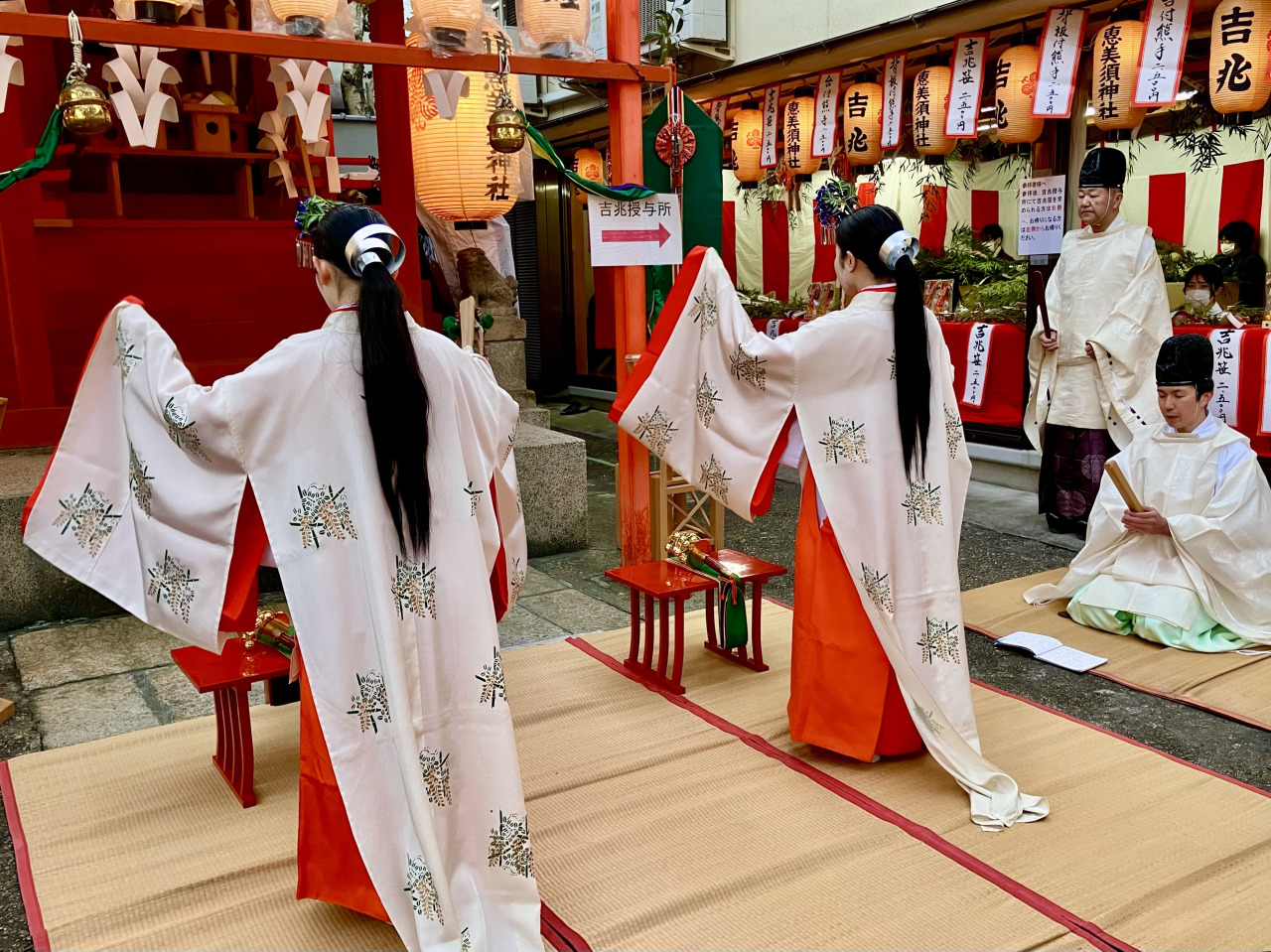 かつて奈良の主要な市場だった「南市」は、「北市」や「高天市」と並び「南都の三市」と呼ばれ栄えました。長い歴史を持つ南市を守り続けてきた市場の神様は、今も招福と商売繁盛の神様として人々の信仰を集め、毎年1月5日に行われる例祭「南市初えびす」では、商売繁盛を願い多くの人々が参拝に訪れます。普段は境内に立ち入ることができませんが、例祭の時はその門が開かれます。1月4日の宵宮祭・宵戎では17時から19時頃まで、1月5日の初戎では終日、はかま姿の福娘が「吉兆笹」を授与。米俵や大福帳などの縁起物を思い思いにつけることができ、参道には縁起ものを売る店が並びます。いつもは静かに南市を見守る神社も、この日ばかりは大変賑わいます。