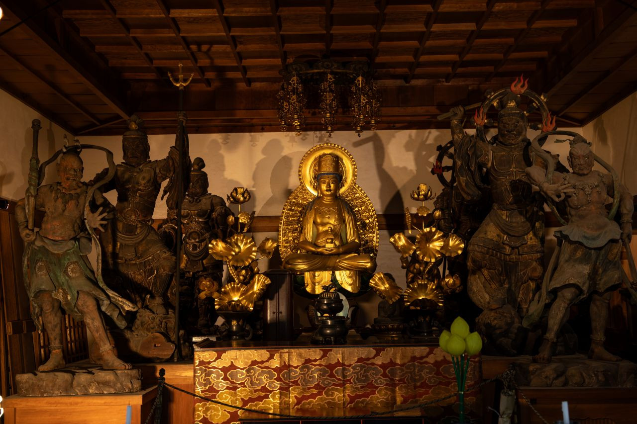 本堂には、多くの仏像が配置され、本尊の弥勒仏は四天王や金剛力士像に囲まれ守られています。中世・江戸時代に厄除信仰の対象となった「八雷神面」は、非常に珍しい造形の神面であり、この面の護符や御朱印も授与されています。境内は、緑や自然が多く残り、憩いの場所となっています。